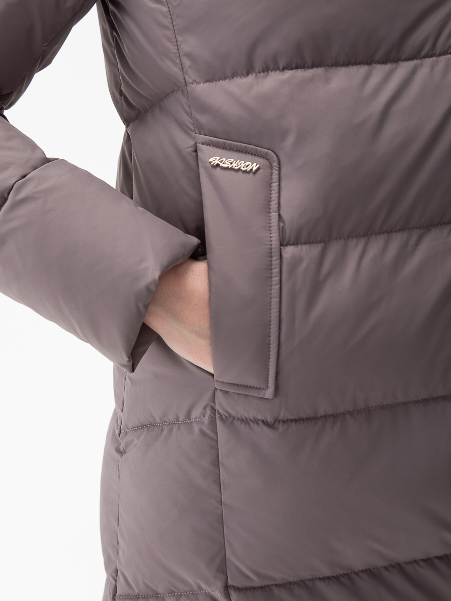 Крой воротника - съёмный капюшон, отделка эко мех